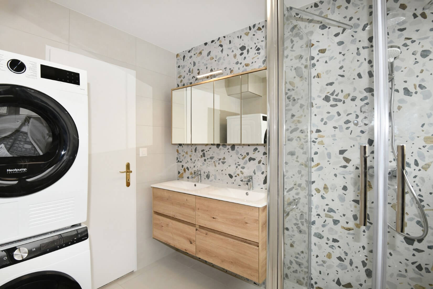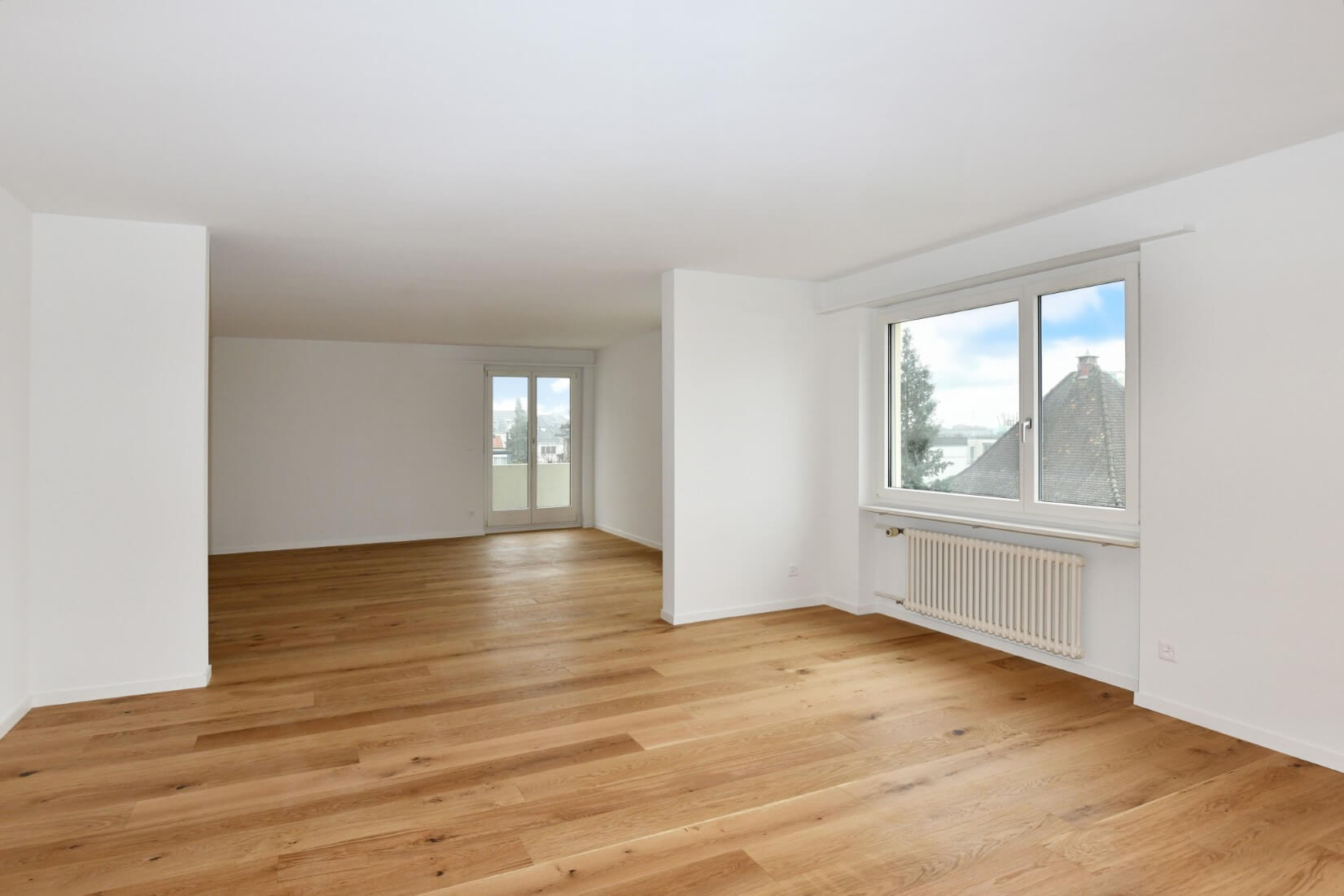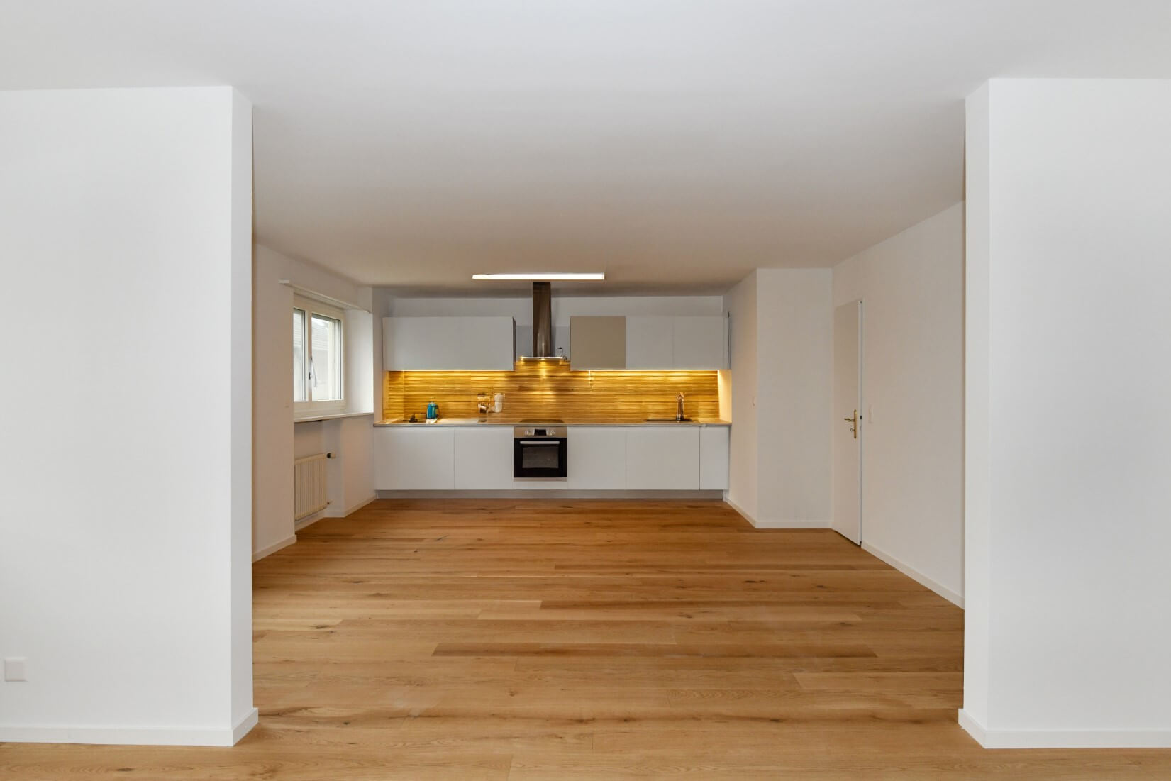 Die gesamte Wohnung wurde nach Kundenwunsch totalsaniert und umgestaltet. Tragende Wände wurden für einen offenen Küchen- und Wohnbereich entfernt. Das Badezimmer wurde modern aufgeteilt und mit einer neuen Dusche erstellt. Ein Waschturm wurde ebenfalls integriert. Der bestehende Verputz wurde in der gesamten Wohnung mit Weissputz Q4 gegipst. Die Elektrik wurde gesamthaft rückgebaut, neu geplant und verlegt. In der gesamten Wohnung wurde ein Parkett im Design Landhausdiele Eiche hell verlegt und Sockelleisten in 60mm angebracht. Planung, Visualisierung sowie Produktion, Lieferung und Anschluss der Küche. Maler und Lackierarbeiten an Decken, Wände, Türen und Zargen sowie bestehenden Einbauschränken.