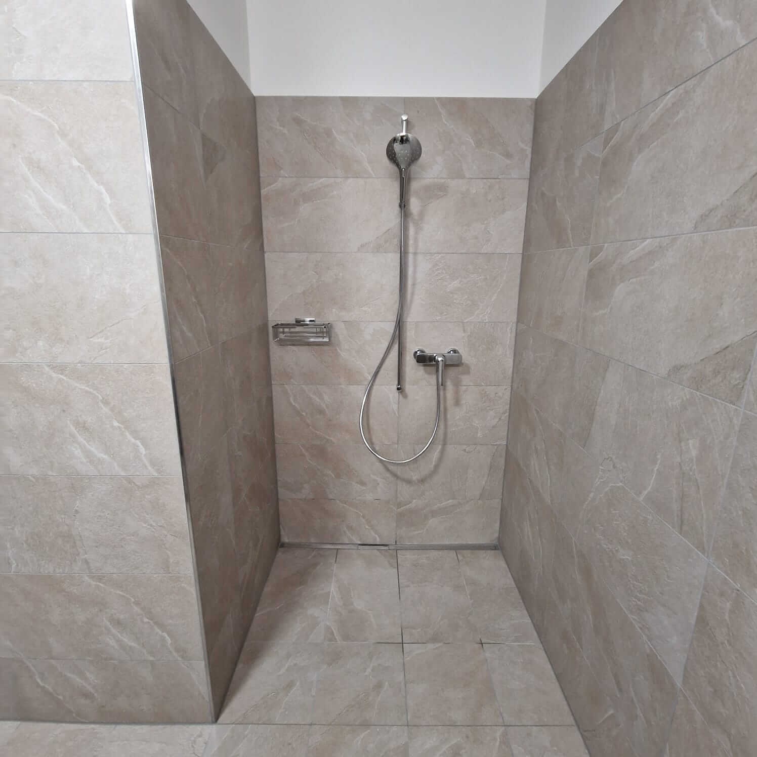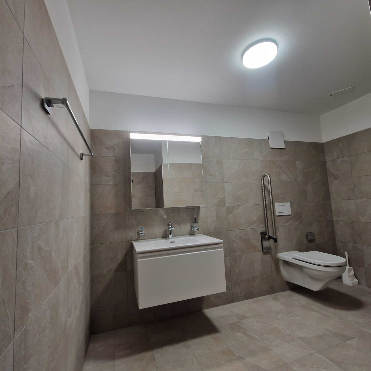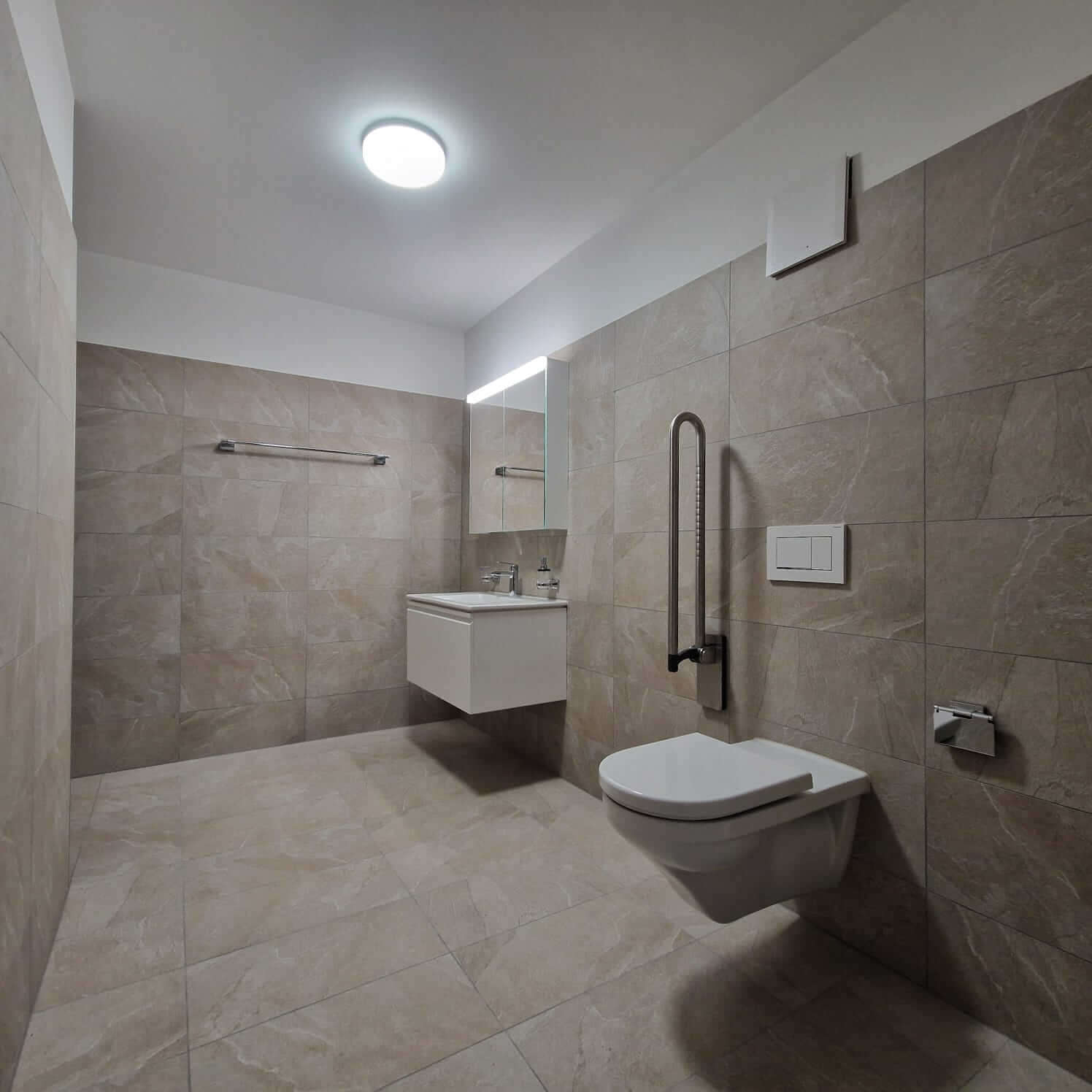 In einem Seniorenheim wurde ein Badezimmer gesamthaft und rollstuhlgerecht neu erstellt. Die Wände wurden im System Trockenbau verbaut. Alle Sanitär- sowie Elektrikleitungen wurden neu erschlossen. Die Dusche wurde «Walk-in» erstellt, um den Zugang mit einem Rollstuhl möglich zu machen. Platten wurden aus Gründen der vereinfachten Reinigung sowie der Hygiene an alle Wände und den Boden angebracht. Ein neuer Boiler für Warmwasser wurde erschlossen und installiert.